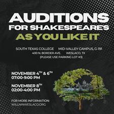 Will'n in Weslaco, the one and only Shakespeare Company in South Texas, is holding Auditions for our annual festival (April 11-25, 2026). Auditions for Shakespeare's As You Like It will be held on November 4th and 6th from 7-9 PM and November 8th from 2-4 PM at the Mid-Valley Campus of South Texas College (400 N. Border Avenue, Weslaco, TX, 78596) in Building G, Room 191. Please use Parking Lot #3. All are welcome to audition!